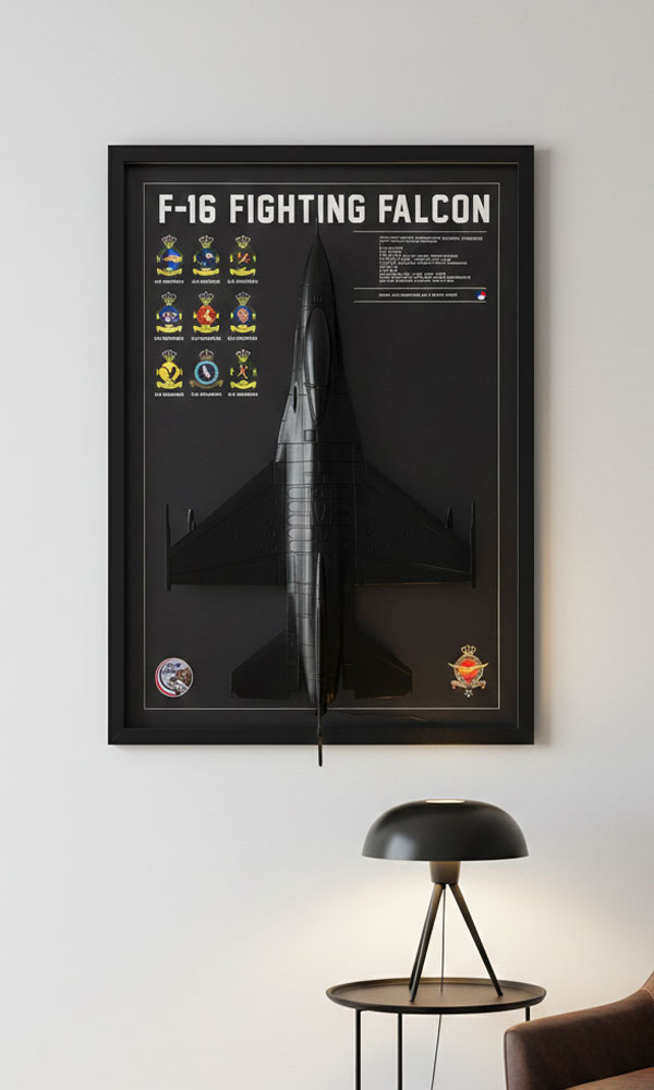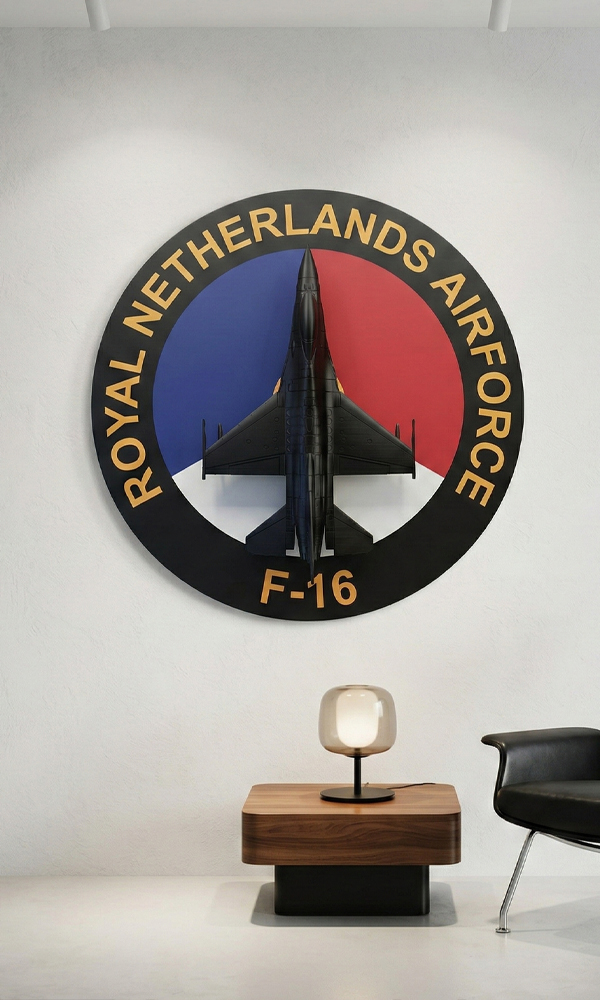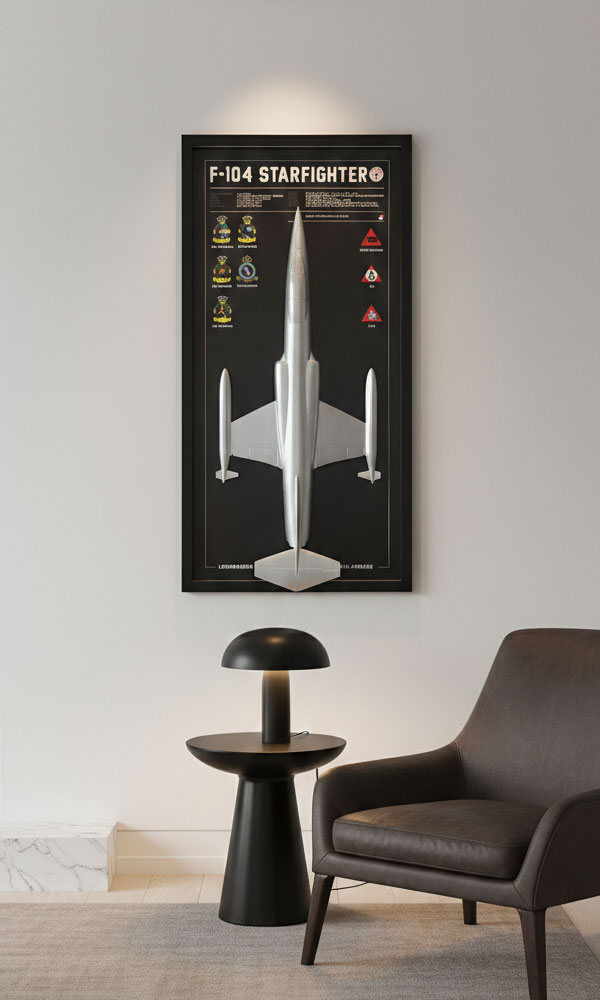 Our concept is simple: we turn real aircraft into timeless display pieces. Whether it is an F-35A Lightning II, F-16 Fighting Falcon, F-104 Starfighter or any historic or modern jet, every artwork is carefully designed around the specific aircraft configuration, squadron markings and operational story. From roundels and patches to callsigns and mission history — every detail matters.